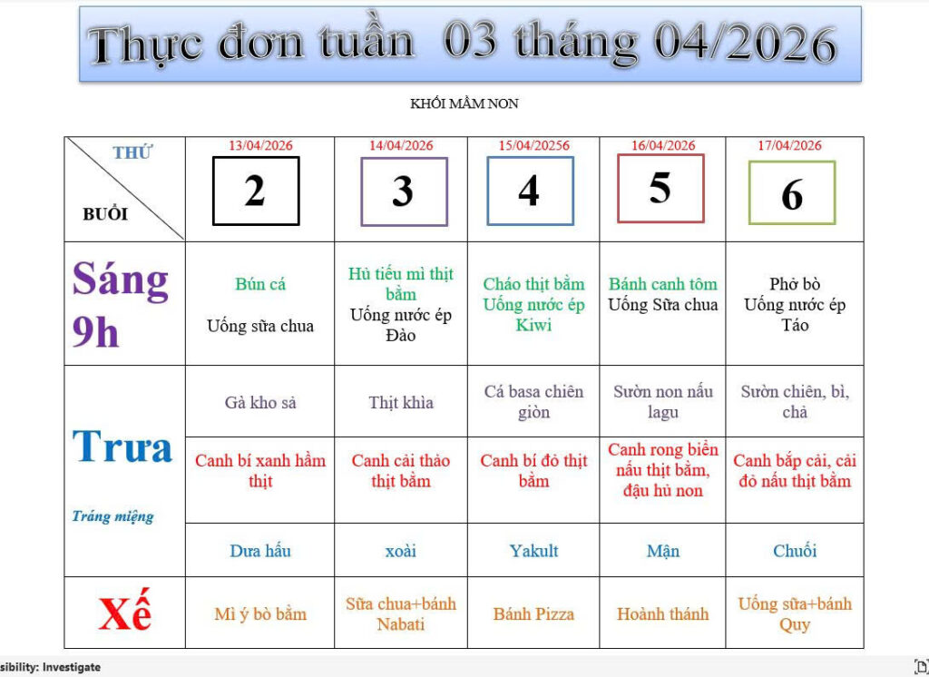 Thực đơn tuần 3 tháng 4 năm 2026 khối Mầm non