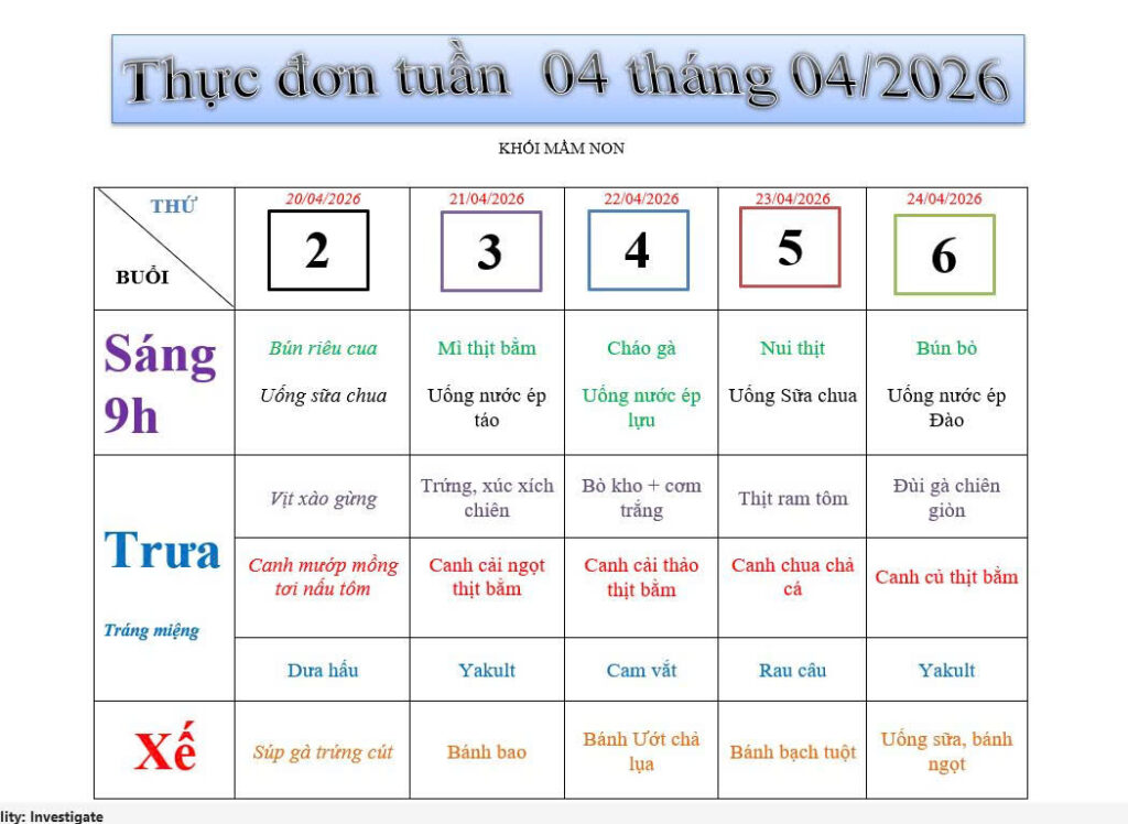 THỰC ĐƠN TUẦN 4 THÁNG 4 NĂM 2026 KHỐI MẦM NON