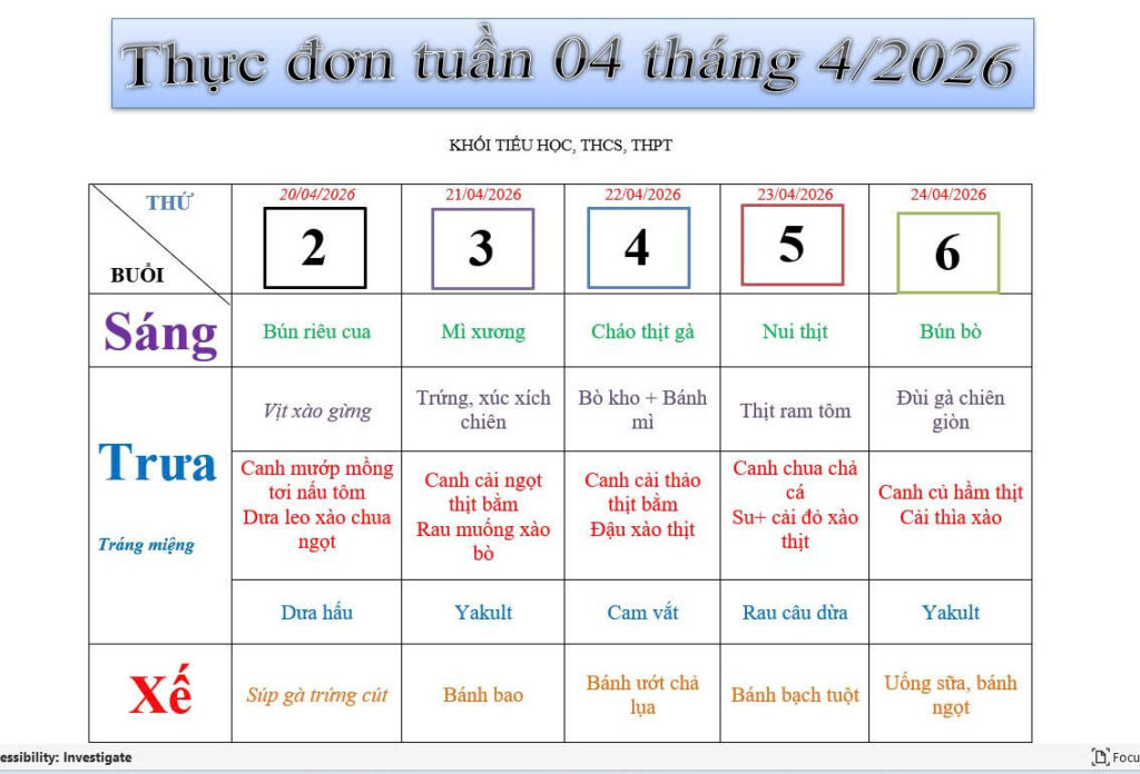 THỰC ĐƠN TUẦN 4 THÁNG 4 NĂM 2026 KHỐI TH, THCS VÀ THPT