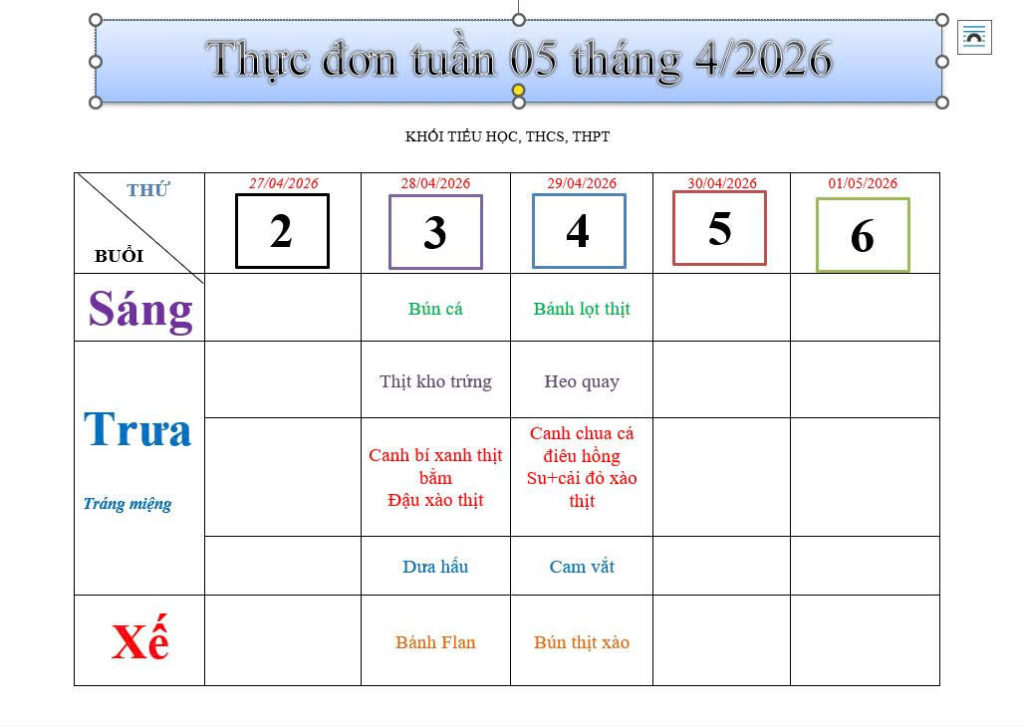 Thực đơn tuần 5 tháng 4 năm 2026 khối Tiểu học, THCS, THPT