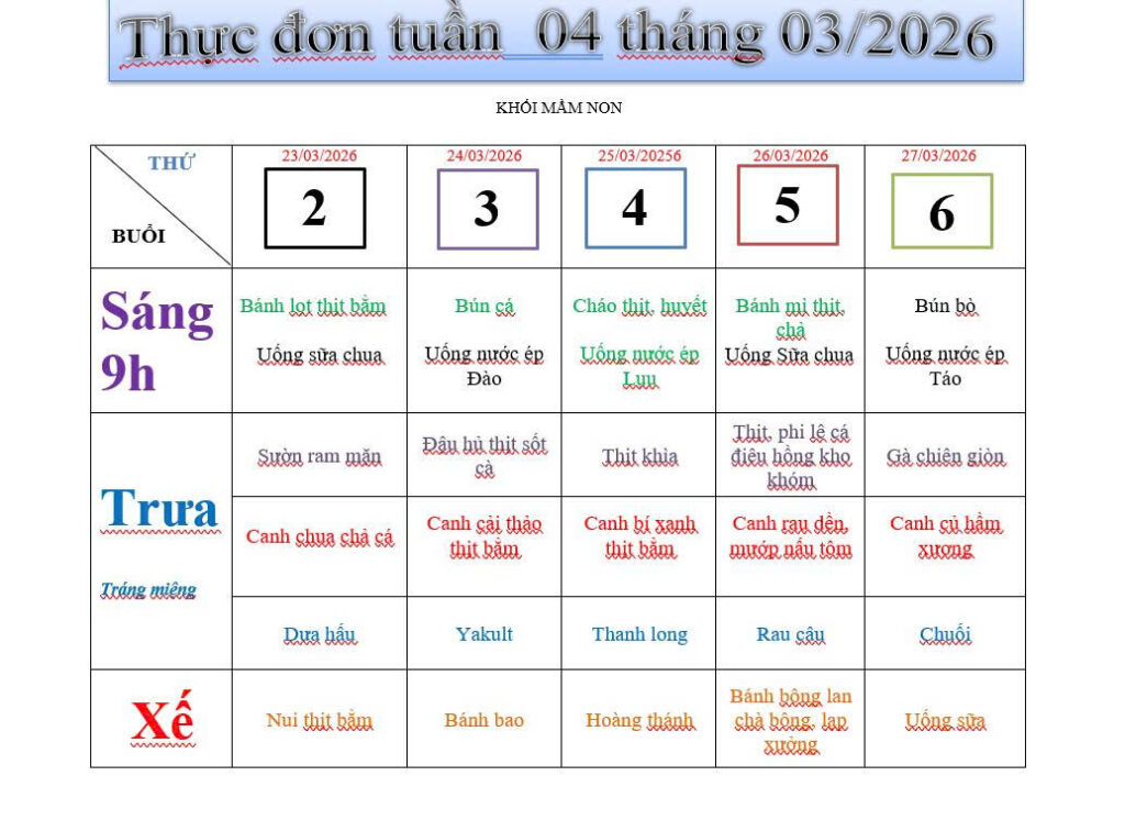 Thực đơn tuần 4 tháng 3/2026 – Khối Mầm non