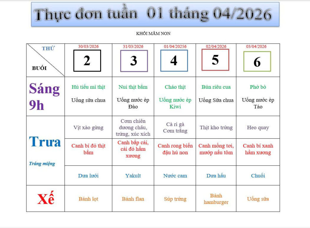 Thực đơn tuần 1 tháng 4 năm 2026 khối Mầm non