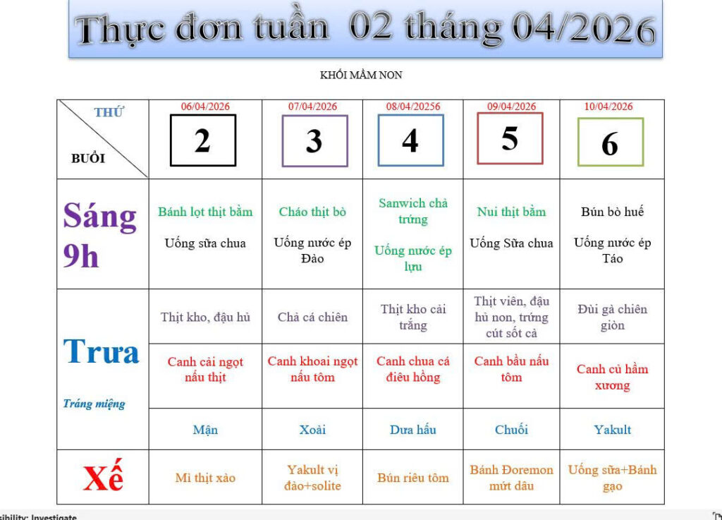 Thực đơn tuần 2 tháng 4 năm 2026 khối Mầm non